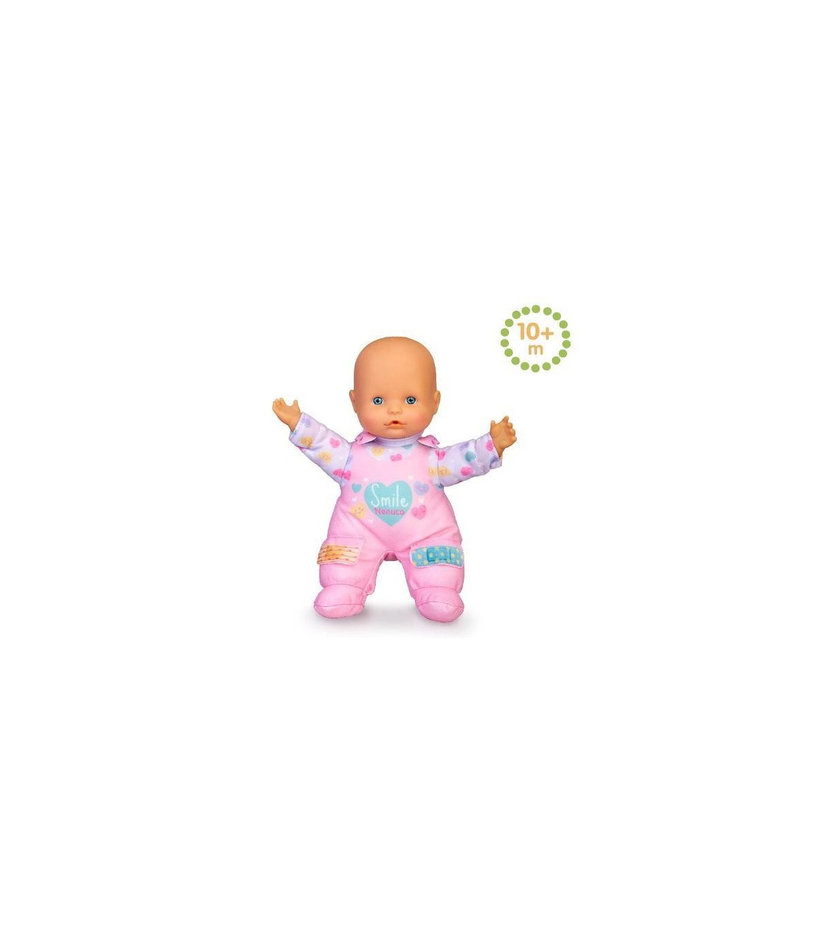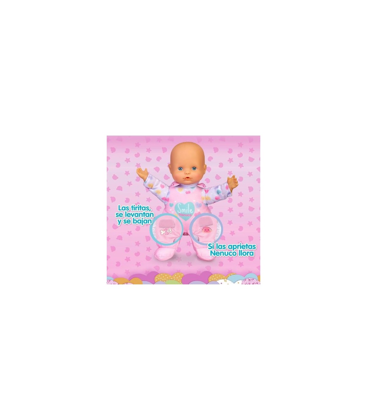 Nenuco de 25 cm con cuerpo blandito El muñeco emite hasta 5 sonidos diferentes Tiene 2 tiritas incorporadas en su ropa que cubren dos pequeñas heridas Cuando aprietas las heridas Nenuco llora Si aprietas sus manitas Nenuco dice mamá y papá o hace sonidos de bebé