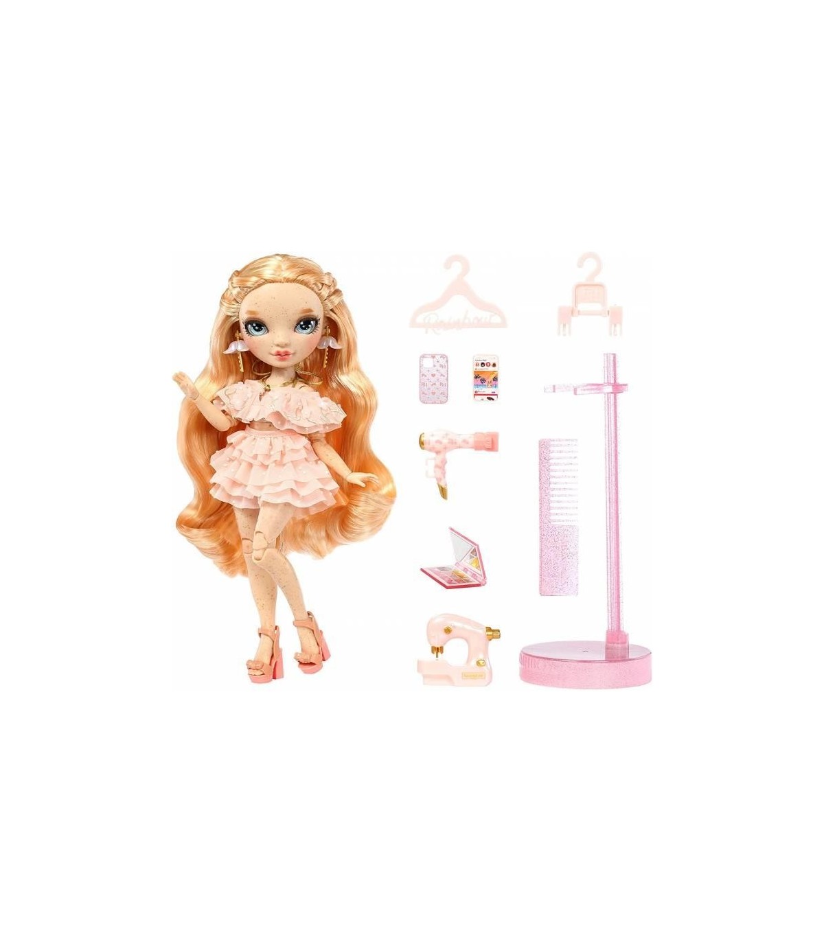 Victoria va vestida de rosa claro de la cabeza a los pies: top y falda de volantes con tachuelas de perlas, pendientes de flores, tacones de lazo rosas y accesorios. Pelo rosa, largo y rizado, pestañas de verdad y ojos de cristal ACCESORIOS QUE INSPIRAN CREATIVIDAD: Victoria es diseñadora de moda. Con sus accesorios esenciales, está preparada para cualquier emergencia: máquina de coser, secador de pelo, paleta de maquillaje y un adorable móvil con su soporte y un portátil a juego QUÉ INCLUYE: Muñeca de moda, look completo para la muñeca, un par de zapatos para la muñeca, accesorios para la muñeca: máquina de coser, paleta de maquillaje, secador de pelo, teléfono móvil + soporte para el teléfono móvil y soporte para la muñeca