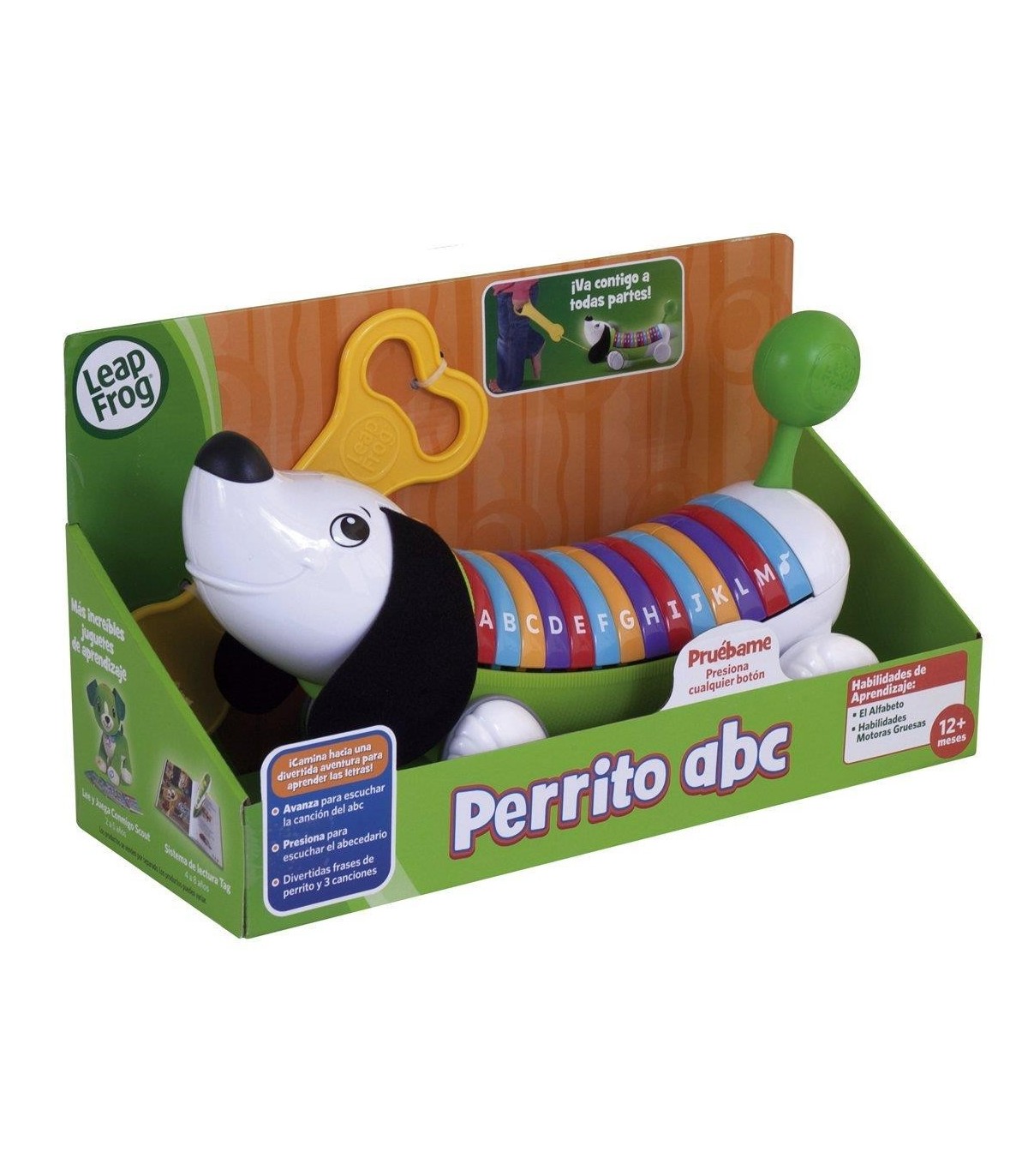 A partir de 12 meses Va contigo a todas partes. Al tirar de su correa canta la canción del abecedario. Presiona los botones de colores para escuchar las letras, una palabra que empieza por esa letra y una frase. Sus ruedas irregulares le hacen tambalearse y mover su colita ayudando a los niños en sus primeros pasos. Enseña: El abecedario, vocabulario y habilidades motrices.