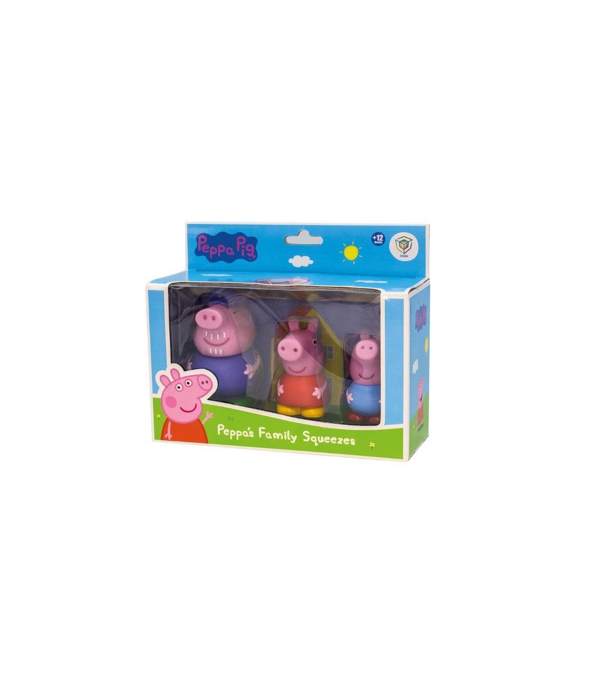 Pack de 3 figuras para el baño. Incluye los personajes de Peppa, George y Abuelo Pig. Las figuras tienen un tamaño entre 7 y 10cm. Son de goma y poseen una apertura para que salga el agia y el aire y evitar que aparezca moho. Son lavables y se pueden limpiar ya que la figura se compone de dos partes (cabeza y cuerpo). Recomendado para mayores de 12 meses.