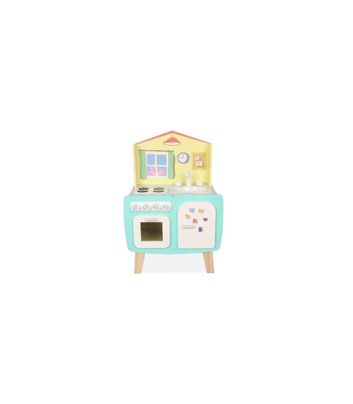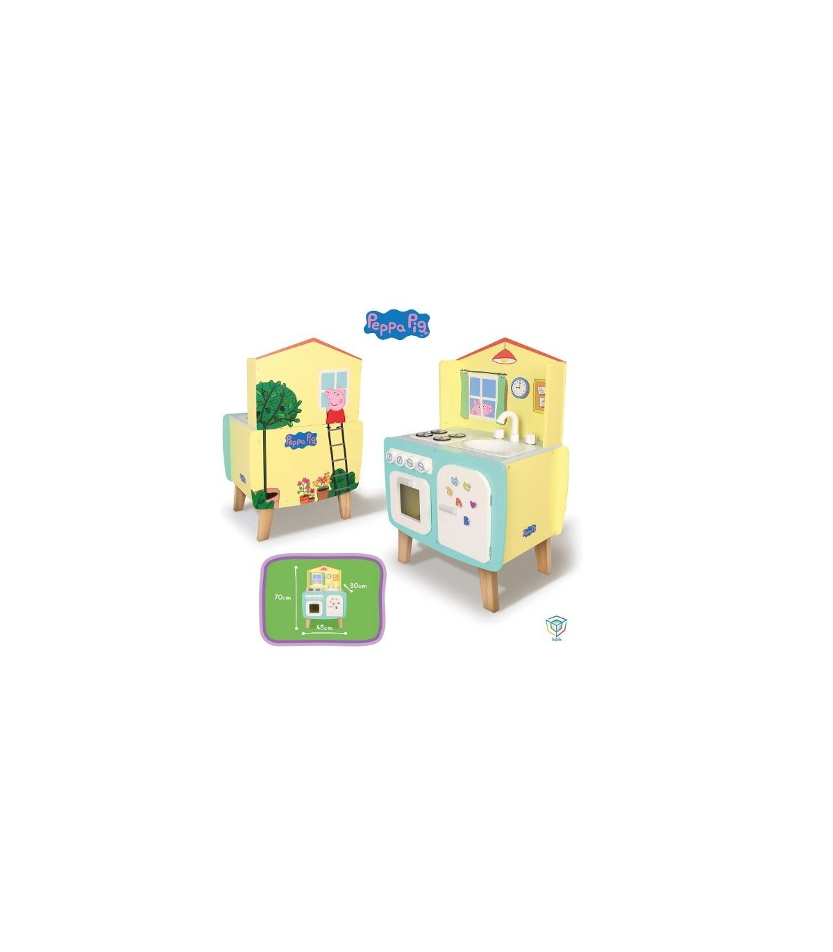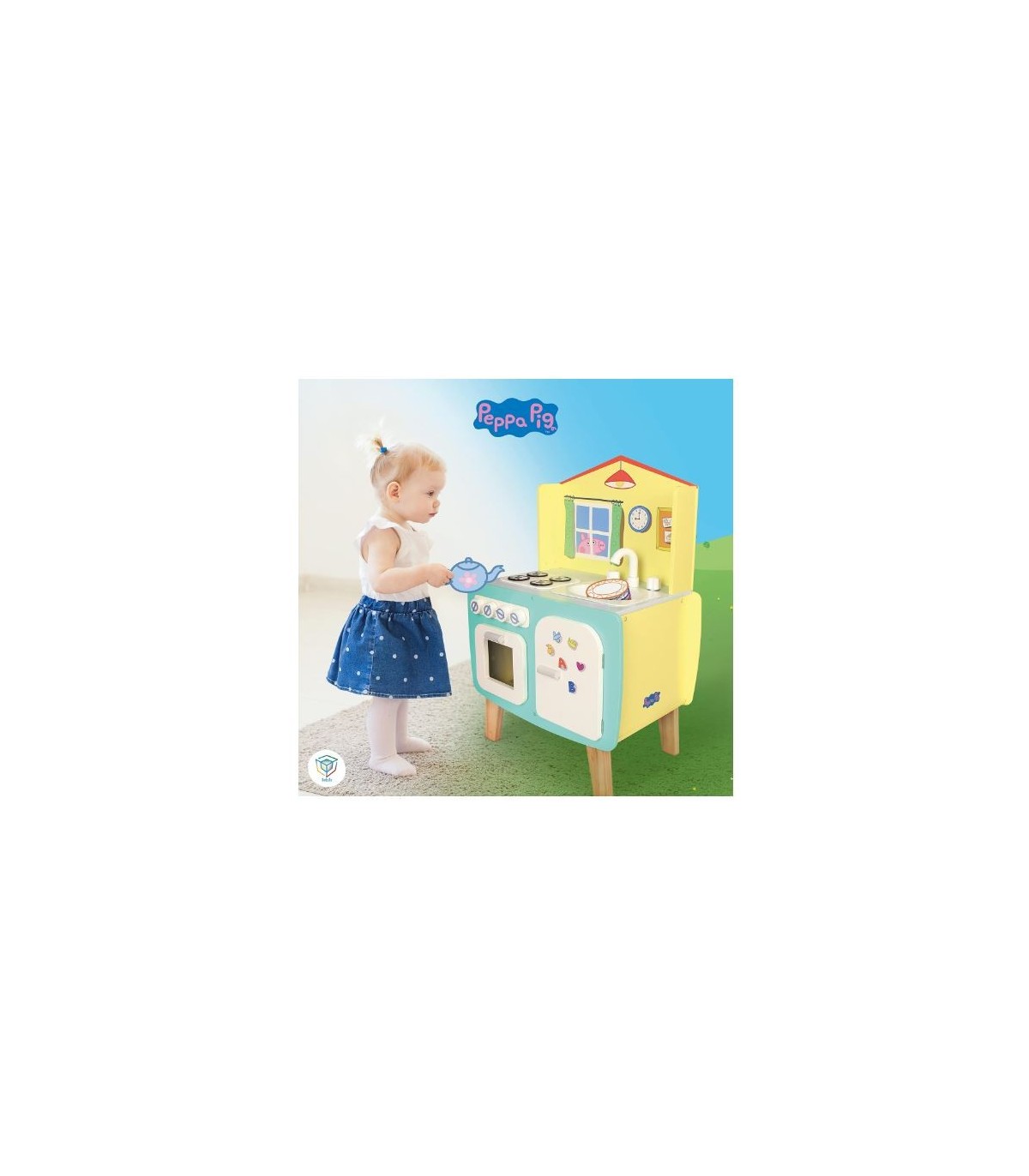 Cocinita de madera de alta calidad y durabilidad. Posee cantos redondeados para garantizar la seguridad de los mas pequeños. Todos los artículos pasan los controles de seguridad exigidos por ley. Materiales de primera calidad. Contiene todos los elementos de la cocna de Peppa Pig: ventana, horno con mandos giratorios, grifo, nevera y fuegos para dar más realismo al juego.
