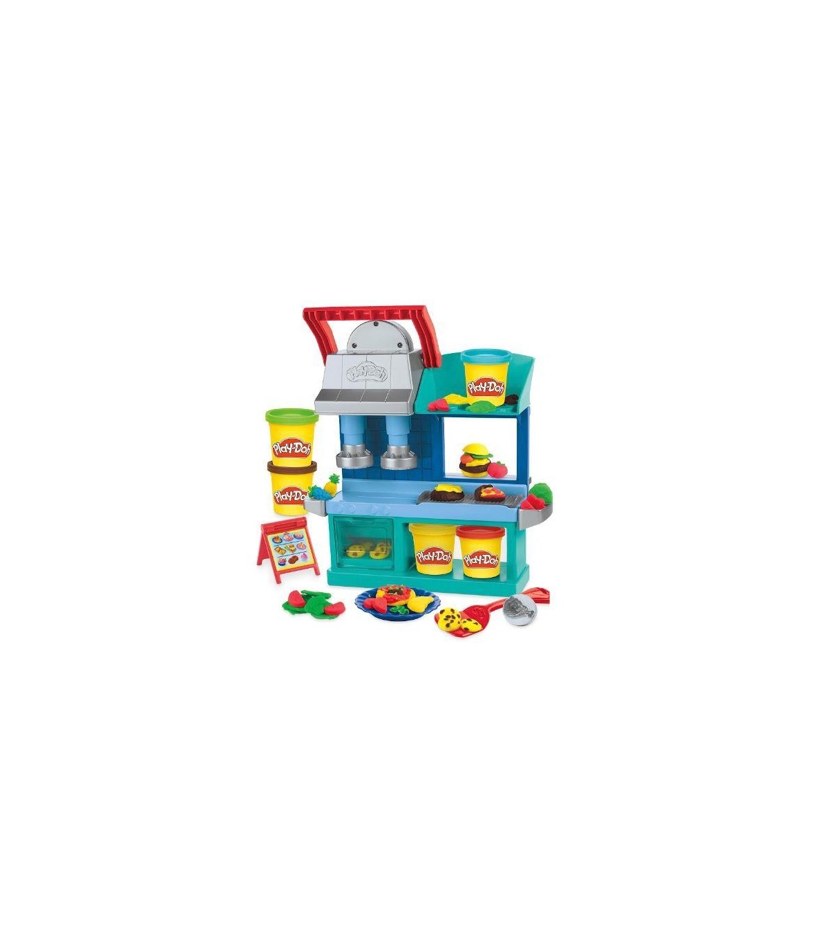 ¡El set Restaurante divertido de Play-Doh permite que los niños sientan que tienen su propio restaurante al crear, personalizar y compartir sus creaciones culinarias Play-Doh con sus clientes! Los niños podrán colocar con facilidad los sellos para crear pizzas, hamburguesas, pasta o pollo Play-Doh. Baja la palanca para moldear 2 tipos distintos de comida de juguete a la misma vez. ¡Luego suelta la palanca y mira cómo la plancha se mueve hacia la estación de preparación! Crea ingredientes de hamburguesa de juguete, increíbles patatas, divertidas galletas y otras comidas de juguete con los medios moldes en ambos lados del set de juego. ¡Coloca tus creaciones en el plato y pásalo por la ventanilla para entregar el pedido a tus amigos! El minicartel del menú y el resto de los accesorios de la cocina de juguete aumentan la diversión y el juego imaginativo. Estos juguetes de cocina para niños y niñas a partir de 3 años son un regalo fantástico para los niños que adoran jugar con comida de juguete. Hasbro, Play-Doh y todas las propiedades relacionadas son marcas registradas de Hasbro.