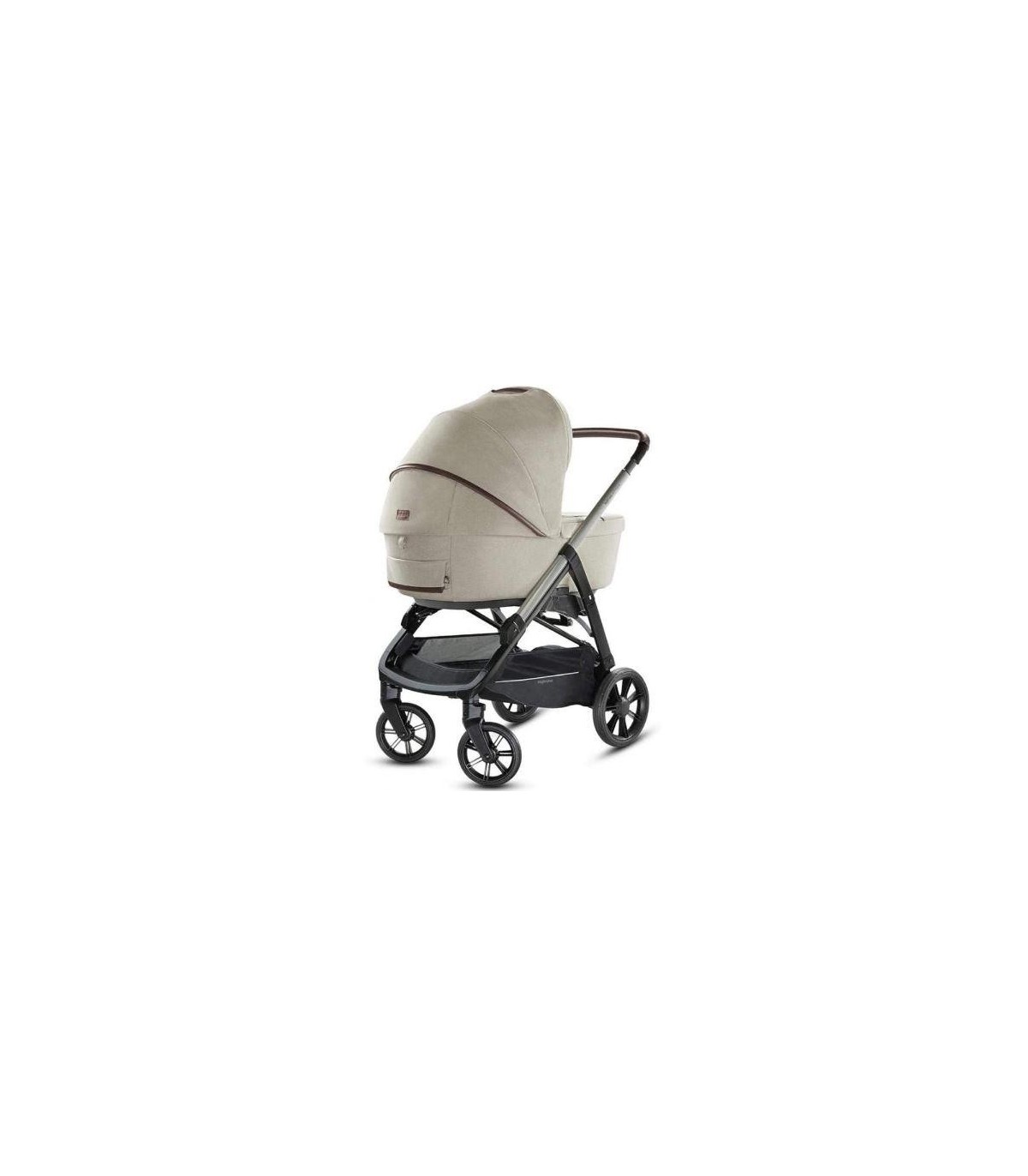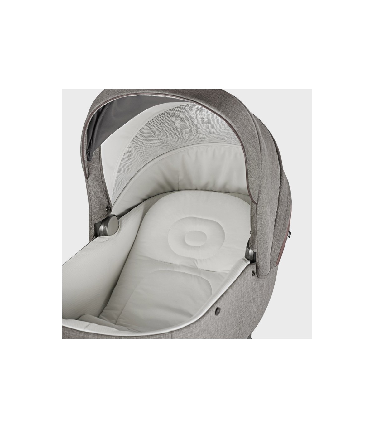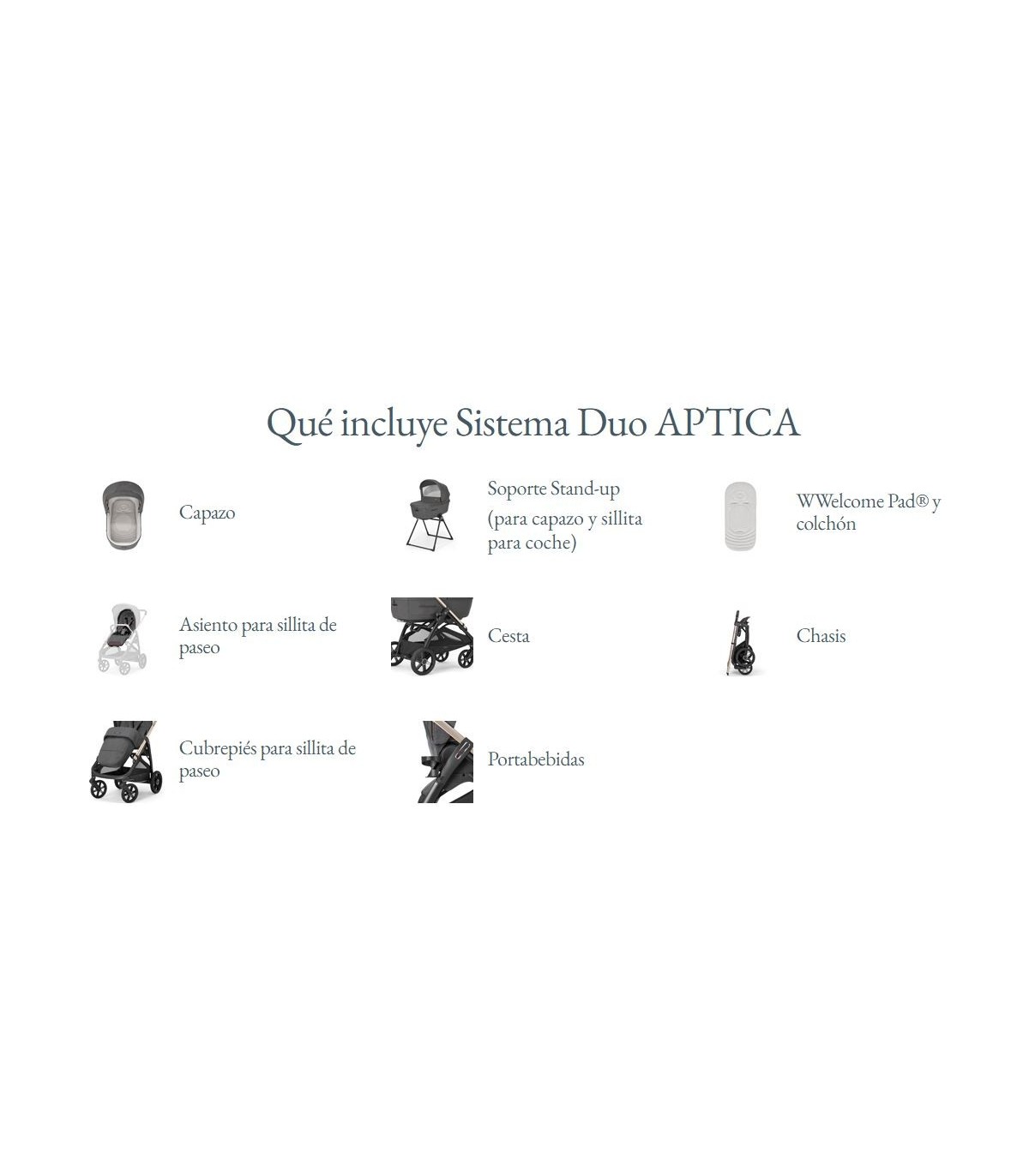 Aptica coche de inglesina con capazo extragrande y colchón hecho de espuma con una densidad media con 40 agujeros de ventilación distribuidos uniformemente. La parte en contacto con el bebé está cubierta con fibra de bambú transpirable. Se aplica una malla 3D en la parte inferior para mejorar la circulación del aire y evitar la humedad. Reduce el riesgo de sufrir plagiocefalia (o síndrome de cabeza plana). Favorece el mantenimiento de una posición cómoda en decúbito supino y la alineación de las extremidades en la línea central. Gracias al soporte «Standup», el capazo puede colocarse de forma cómoda e higiénica dentro de casa (también en los traslados), transformándose en una verdadera cuna para la noche que se pondrá a tu lado. Portabebé Cab Grupo 0+, homologado según el reglamento europeo ECE R44/04 para el grupo 0+ (de 0 a 13 kg de peso). La sillita de paseo se cierra con el asiento enganchado tanto de cara a la madre como de cara a la calle y permanece en posición vertical de manera autónoma sin que el textil ni el manillar toquen el suelo. Dimensiones internas capazo:
