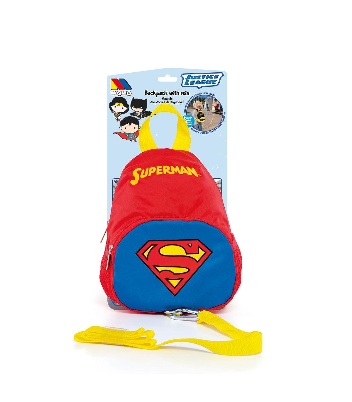 Mochilita de Superman de la liga de la Justicia. La mochila tiene una función de arnés con un cierre frontal de seguridad. Cuenta con correa de seguridad removible, correas ajustables y asa superior para los viajeros más pequeños. Cierre con cremallera Correa de 90 cms. se puede quitar y queda como una mochila de guarderia. El interior de la mochila incluye bolsillo portaobjetos. Incluye una etiqueta interior para personalizar con el nombre del niño. Incluye correa de seguridad y arnés. Mosquetón de seguridad del arnés. Bolsillos de red para botellas o brick de zumo Medidas: 20x27x11 cms.