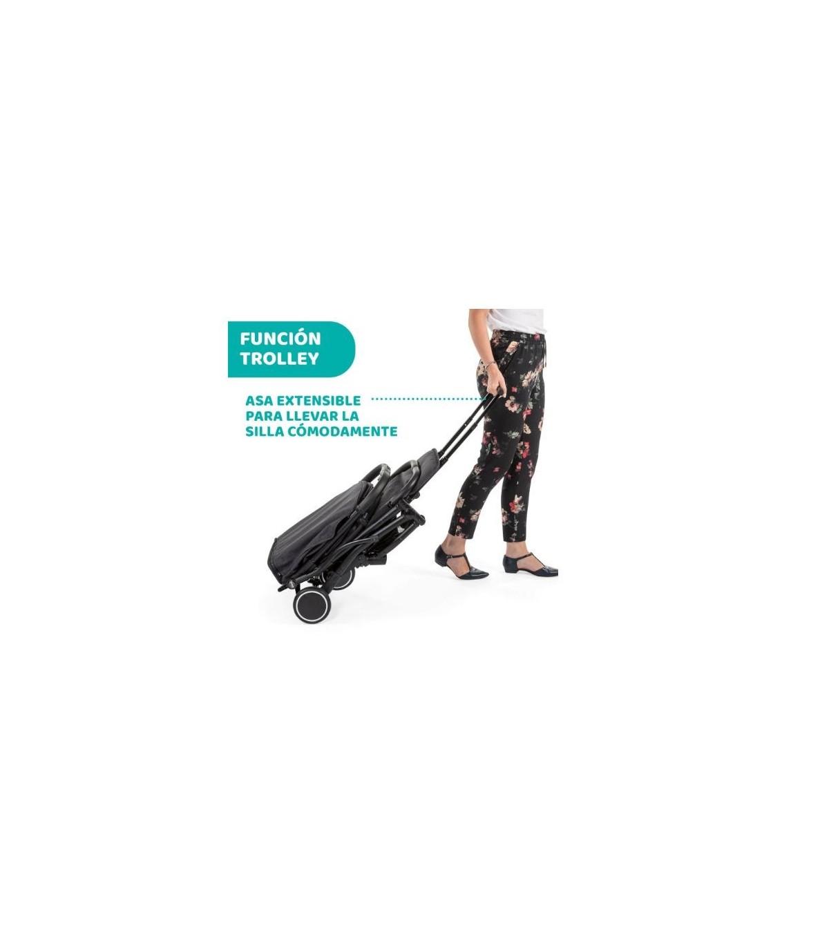 La silla de paseo que se puede transportar como un trolley, para pasear al bebé y poder transportarla cómodamente cuando está plegada. Su sistema de plegado compacto con una sola mano, y su asa extensible para transportarla permite a los padres moverse con la silla cómodamente con o sin el bebé durante los paseos. Una vez cerrara, se mantiene de pie plegada, y el asa puede guardarse o extenderse según se vaya a guardar o transportar. Trolley Me está homologada desde el nacimiento, por lo que su respaldo es completamente reclinable y se puede ajustar en múltiples posiciones. Su amplio y cómodo asiento con arneses de hombros y separapiernas acolchados ofrece al bebé una máxima comodidad, y su barra delantera con una abertura frontal permite colocar al niño fácilmente en la silla. Además, cuenta con una ventana en red en la capota para poder ver al niño en la silla.