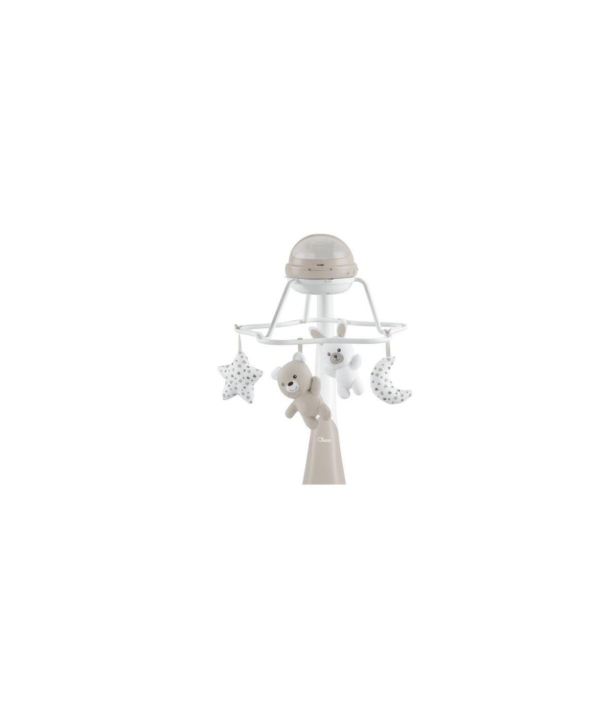 carrusel de cuna de color neutro con sonidos y proyector luminoso
