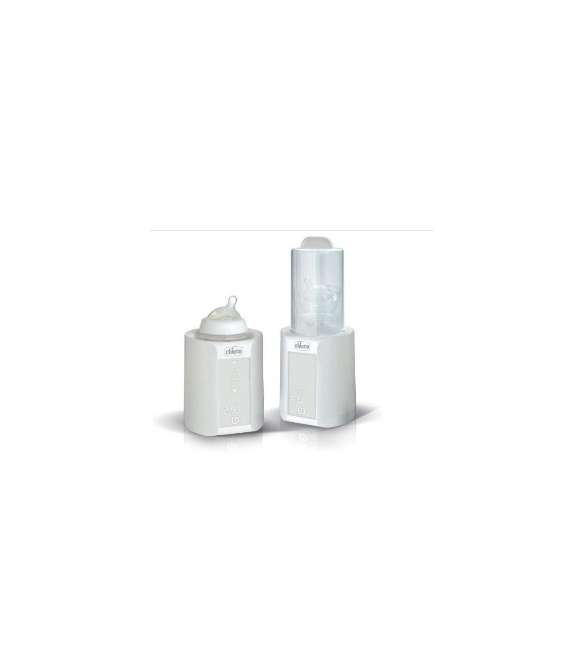 El calienta biberones digital con esterilizador 4 en 1 de Chicco calienta la leche materna y de fórmula, calienta tarros de comida, descongela la leche y los alimentos para el bebé de forma rápida y sencilla y esteriliza biberones y pequeños accesorios. Este calienta biberones con esterilizador ha sido diseñado para calentar la leche de forma gradual, lo que le permite conservar los nutrientes. Calienta la leche en 3* minutos a 37 °C, la temperatura más adecuada para alimentar al bebé. Está equipado con 27 programas específicos para seleccionar la temperatura inicial de la comida, el tipo de leche o comida y el tamaño del biberón o potito y programar la esterilización. Además el temporizador permite programar el calentamiento de la leche o de los alimentos con antelación (hasta dos hora), también permite mantener el calor durante 1 hora, permite incluso descongelar la leche de forma segura con la función específica que proporciona un descongelado suave y gradual. El calienta biberones con esterilizador es compatible con todos los biberones y tarros de Chicco y es idóneo para el Perfect5 ya que posee una función especial para biberones de base desmontable, también es compatible con otros biberones del mercado. Posee un exclusivo sistema de alerta de limpieza anti cal. Incluye un cómodo soporte para coger fácilmente los biberones y potitos y reducir el riesgo de quemaduras. Para la preparación, se aconseja controlar siempre la temperatura de la leche o de la papilla antes de alimentar al bebé y consumir la leche inmediatamente después de calentarla. En el caso de la leche en polvo, calentar una vez y tirar la leche sobrante.