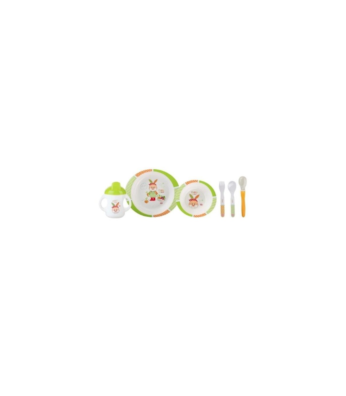 Vajilla 6 piezas FUNNY CHILD Esta compuesta por: 1 plato de material resistente, 1cuchara blandita, 1 cuenco, 1 taza con dos asitas y tapa, 1 cuchara, 1 tenedor Muy resistente. Se puede lavar en lavavajillas. Se puede utilizar en microondas.