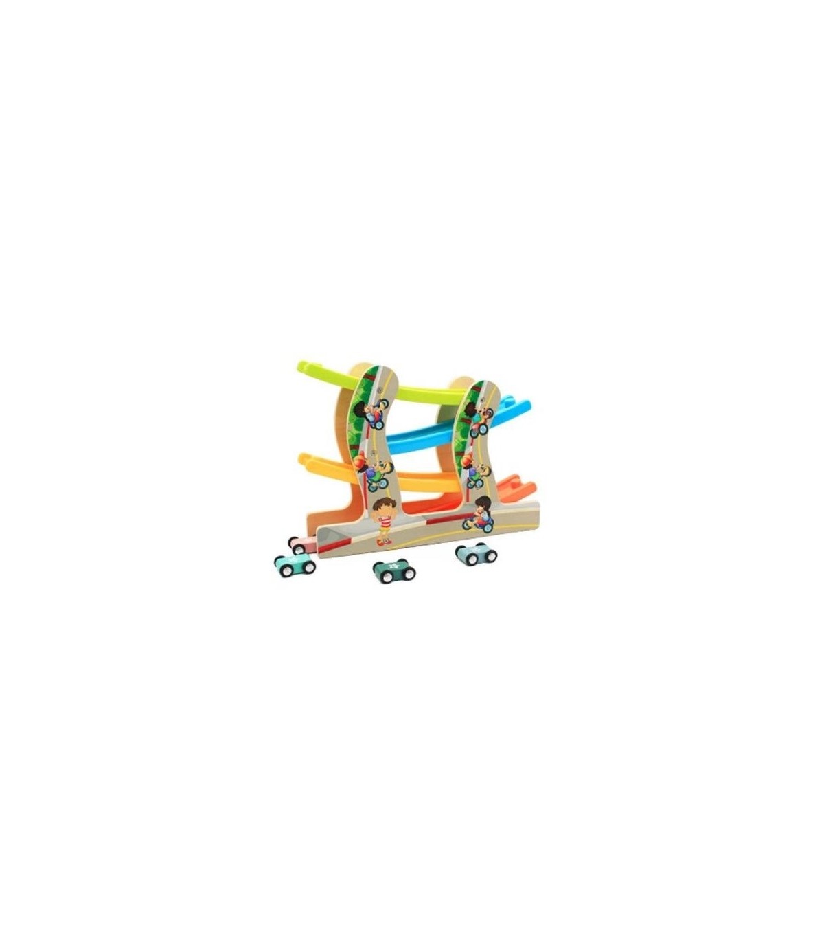 divertido juego con piezas de madera para jugar a lanzar tus vehiculos a traves de las rampas. incluye vehiculos en madera